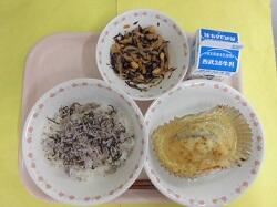 ・麦ごはん(しらすゆかりふりかけ)・メルルーサの味噌チーズ焼き・豚肉とひじきの炒め煮・牛乳