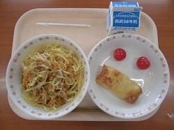 ・バンバンジー麺・ポテトチーズ春巻き・ミニトマト・牛乳