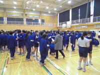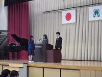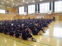 校歌斉唱のあと、校長からは、「一年の計は元旦にあり」という話から、昨年なにかと話題になった「アンパンマン」について、そして、この1年間頑張りたいことの話を生徒に伝えました。続いて、「歯・口の健康に関するポスターコンクール」「ZWEIカップ(バスケットボール)」の表彰、登下校に関する安全担当職員からの話、給食委員会と保健委員会の合同で行う感染症予防キャンペーン(給食時のハンカチ点検)及びリクエスト給食についての話、生活・安全委員から1月の生活目標についての話が行われました。